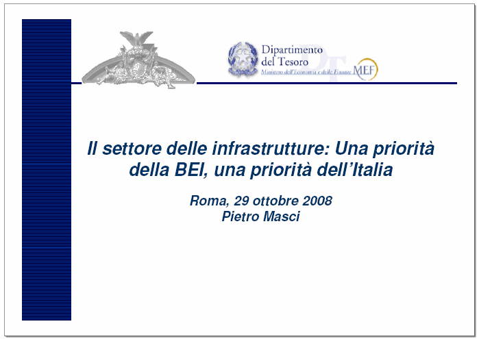 Pietro Masci Il settore delle infrastrutture: una priorità della BEI, una priorità dell’Italia MEF Roma - 29 ottobre 2008 Nel periodo 2003-2007 l’Italia ha assorbito oltre 29 miliardi di euro in finanziamenti della BEI (di cui il 40% circa in prestiti globali) (click sull'immagine per leggere la presentazione) (10/29/2008) |