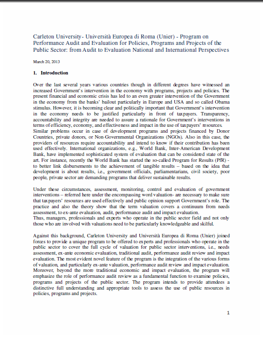 Against this background, Carleton University and Università Europea di Roma (Unier) joined forces to provide a unique program to be offered to experts and professionals who operate in the public sector to cover the full cycle of valuation for public sector interventions, i.e., needs assessment, ex-ante economic evaluation, traditional audit, performance audit review and impact evaluation. The most evident novel feature of the program is the integration of the various forms of valuation, and particularly ex-ante valuation, performance audit review and impact evaluation. Moreover, beyond the more traditional economic and impact evaluation, the program will emphasize the role of performance audit review as a fundamental function to examine policies, programs and projects of the public sector. The program intends to provide attendees a distinctive full understanding and appropriate tools to assess the use of public resources in policies, programs and projects.